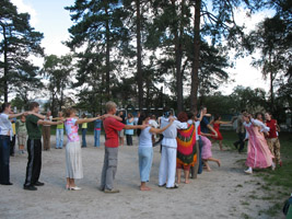 На слёте множество чудесных игр, обрядов, танцев, состязаний, конкурсов и хороводов было. К открытию мы показали хоровод любимый мой «Звента-Свентана», немного разучив его заранее с гостями. Весёлый дождик нас решил омыть, мы в помещение с аппаратурой убежали… Пока всё это снова подключали, нас выручал незаменимый Витя-гармонист. Под плясовую вышли танцевать те, кто смелее… А к остальным я приставала с танцами-поклонами и уговорами, чтоб поскорей себя участниками ощутили гости. Народные мелодии чудесно зажигают души и радостью светиться лица начинают. А для себя смотрю, танцуя, замечаю, как некоторые в народном танце конвульсивные движенья с дискотек изображают и понимаю, что другого, видимо, ещё и не умеют люди, нужно исправлять. Друг другу девушки и парни по очереди показали мастерство в народном танце. Потом ещё для всех разучивали хоровод показанный, и в «ручеёк», забытый многими, играли. И парами скульптуры сочиняли и изображали, фантазию свою и гибкость демонстрируя народу. Длинноволосым косу заплетало сразу двое человек, учась взаимодействию успешному… Был конкурс нежных слов для половинки, он сразу показал красноречивость и запас словарный, привычку к делу этому и смысл нежности самой (от «ты моя мечта» до «милый, мусор вынеси скорее»).
